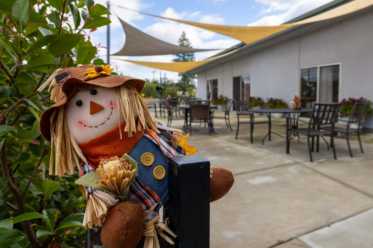 A scarecrow out in the courtyard of Oak Ridge
