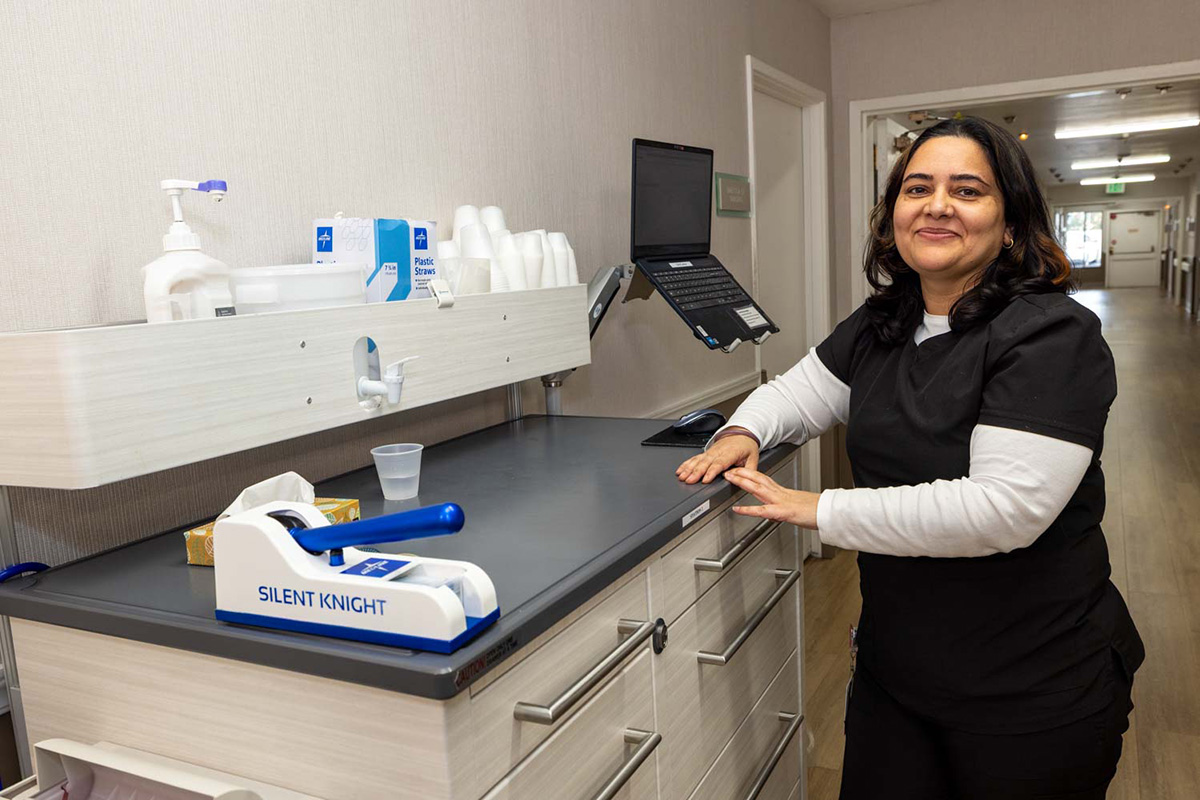 A nurse standing at the nurse's station at Oak Ridge